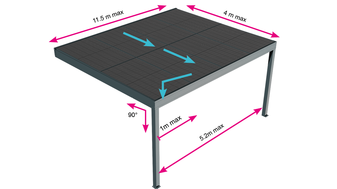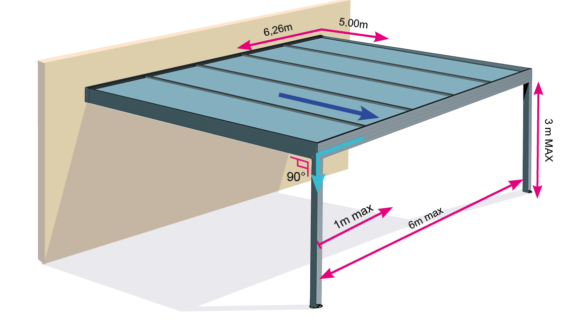 Evacuation de l’eau : intégrée dans les poteaux pour la majorité des modèles.