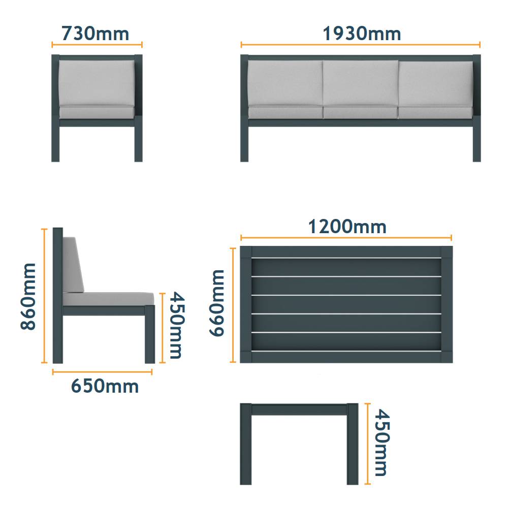 La composition 4 places se compose de : 1 fauteuil une place + 1 canapé trois places + 1 table basse.