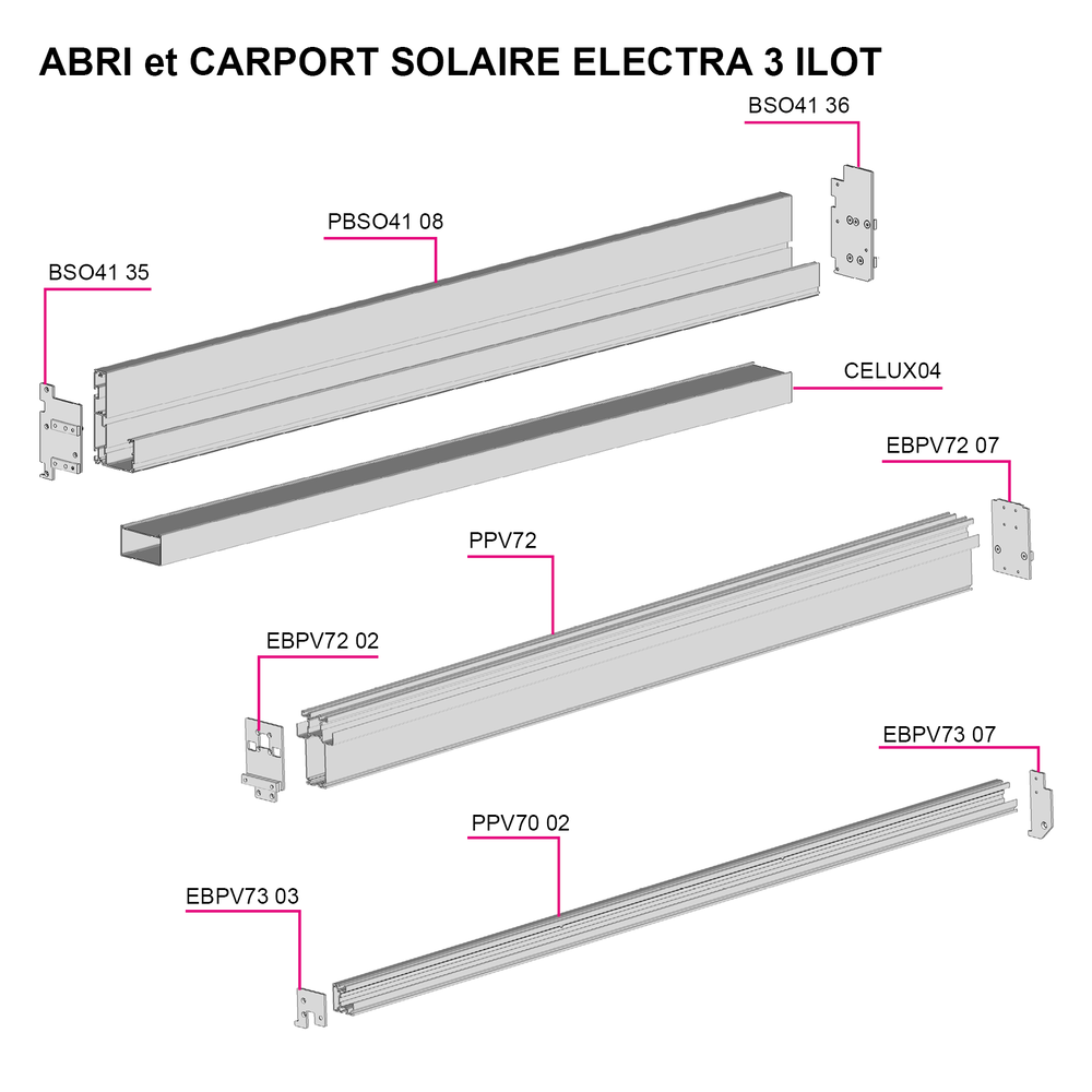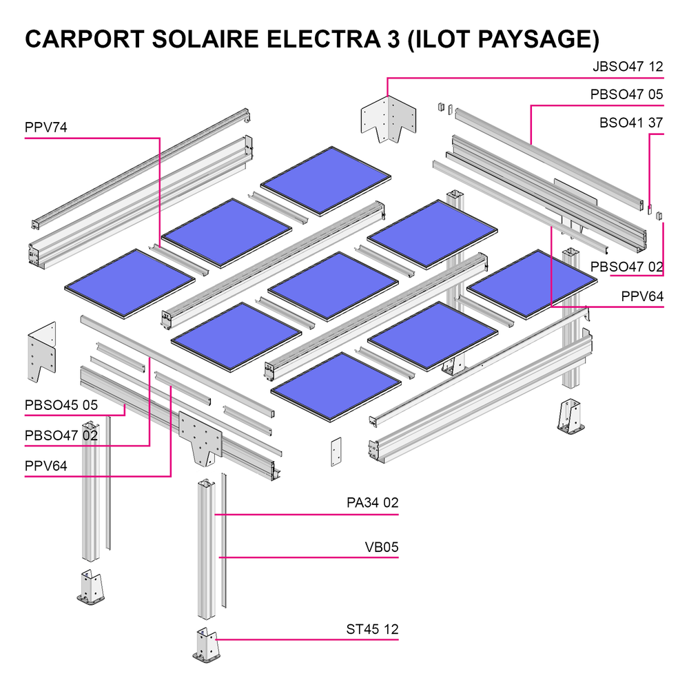 • Compatible avec tout type de panneaux photovoltaïques cadrés (30 à 50mm, largeur max 1150mm et longueur max 2000mmx3 ou 2200mmx2. Trous de fixation, diamètre 9mm nécessaire sur le grand côté du panneau.