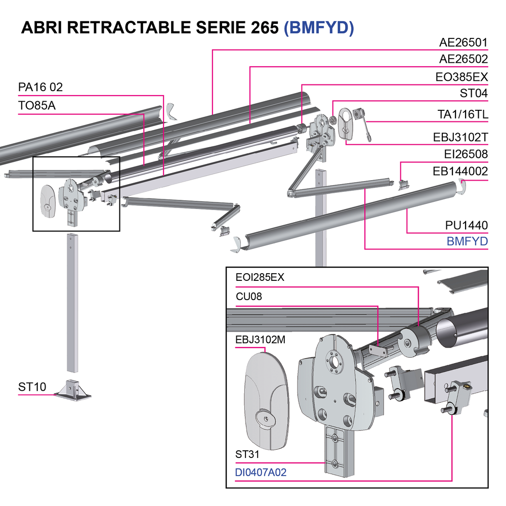 • Bras BMFYD à ressort de traction assurant une tension constante de la toile.
